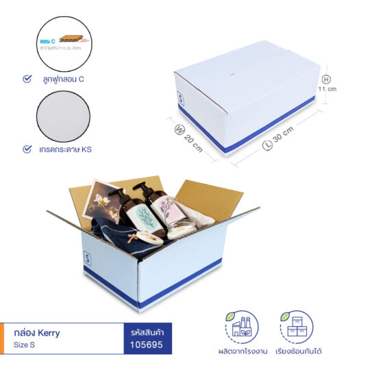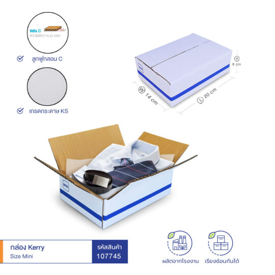 กล่องไปรษณีย์ไทยสำหรับรองรับการขนส่งของบริษัทขนส่งอย่าง Kerry โดยเฉพาะทางหงส์ไทยเองก็มีเลือกใช้งานกัน โดยจะมีขนาดของตัวกล่องอยู่ทั้งหมด 6 ขนาดด้วยกัน ได้แก่ Mini ,S, S+, M, M+ และ L ตัวกล่องจะผลิตมาจากกระดาษลูกฟูก 3 ชั้น มีความแข็งแรง น้ำหนักเบา ทนทานต่อการวางซ้อนกันได้ดี สามารถชมสินค้าได้ที่ hongthaipackaging.com/box-size-kerry/