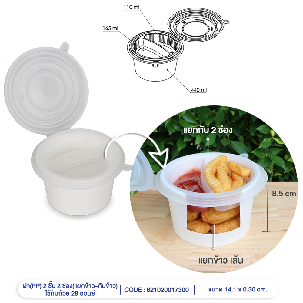 - ฝา(PP) 2 ชั้น 1 ช่อง(แยกกับข้าว)ใช้กับถ้วย 26,28 และ 38 ออนซ์