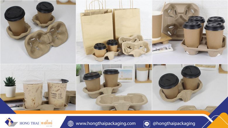 - ถาดใส่แก้ว ผลิตจากกระดาษ เหมาะกับธุรกิจอาหารและเครื่องดื่มทุกชนิด โดยเฉพาะร้านกาแฟใส่แก้ว takeaway delivery ใช้สำหรับแก้วร้อนและเย็น ช่วยให้ลูกค้าได้ซื้อเครื่องดื่มและพกพาได้ง่าย ทั้งยังรีไซเคิลได้