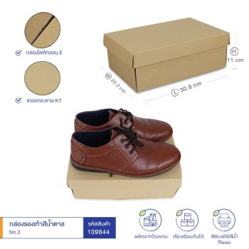 กล่องรองเท้าสีน้ำตาล No.3 | 30.6 | 22.3 | 11 | ขั้นต่ำ 50 ใบราคาเริ่มต้นที่ ฿18.75 / ใบราคารวม VAT | |