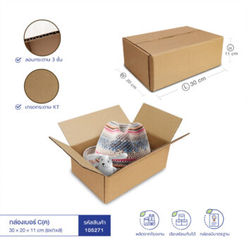 กล่องกระดาษลูกฟูก เบอร์ C(ค) 30x20x11 cm | 30 | 20 | 11 | ขั้นต่ำ 25 ใบราคาเริ่มต้นที่ ฿5.29 / ใบราคารวม VAT | |