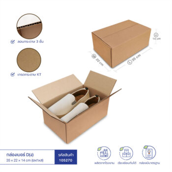 กล่องกระดาษลูกฟูก เบอร์ D(ง) 35x22x14 cm | 35 | 22 | 14 | ขั้นต่ำ 25 ใบราคาเริ่มต้นที่ ฿7.12 / ใบราคารวม VAT | |