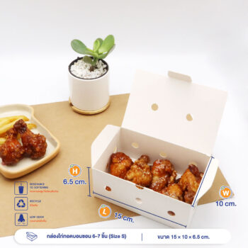 กล่องไก่ทอด สีขาว บรรจุ 6-7 ชิ้น (Size S) ขนาดเดียวกับ กล่องไก่ทอดบอนชอน | 15 | 10 | 6.5 | ขั้นต่ำ 50 กล่องราคาเริ่มต้นที่ ฿4.24 / กล่องราคารวม VAT | |