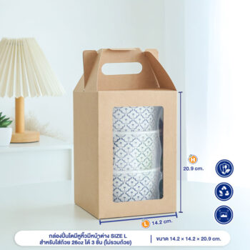 กล่องปิ่นโตมีหูหิ้วมีหน้าต่าง SIZE L สำหรับใส่ถ้วย 26oz ได้ 3 ชั้น (ไม่รวมถ้วย) | 14.2 | 14.2 | 20.9 | ขั้นต่ำ 10 ใบราคาเริ่มต้นที่ ฿14.00 / ใบราคารวม VAT | |