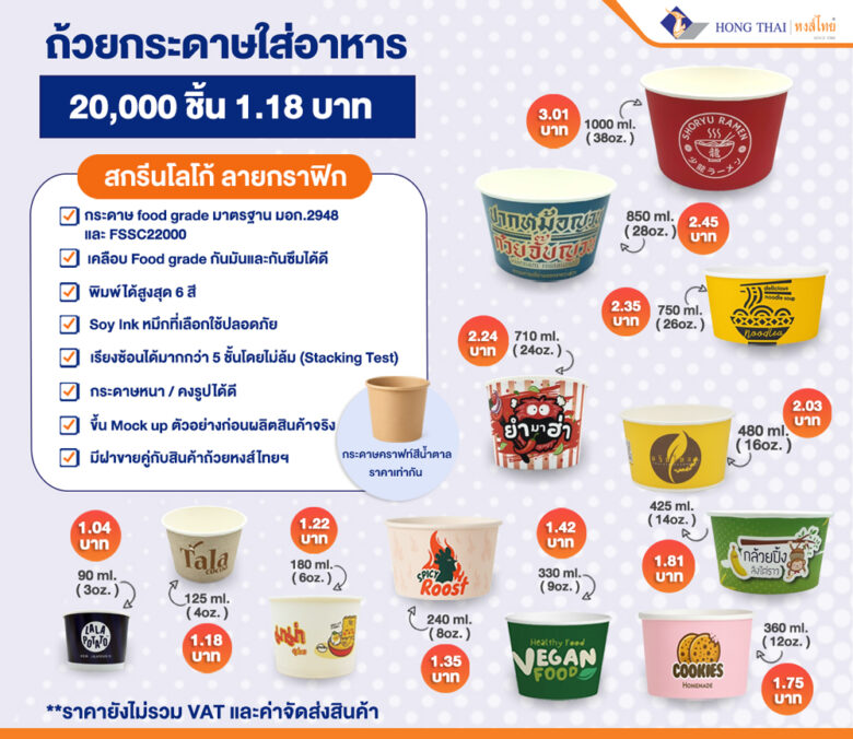 โรงงานรับผลิตถ้วยกระดาษใส่อาหาร พิมพ์โลโก้ ลายกราฟิก ราคาเริ่มต้น 1.18 บาท ผลิตได้มาตรฐานลูกค้าไว้วางใจมากว่า 40 ปี พิมพ์เต็มพื้นที่ 6 สีคมชัด รองรับผลิตจำนวนมาก