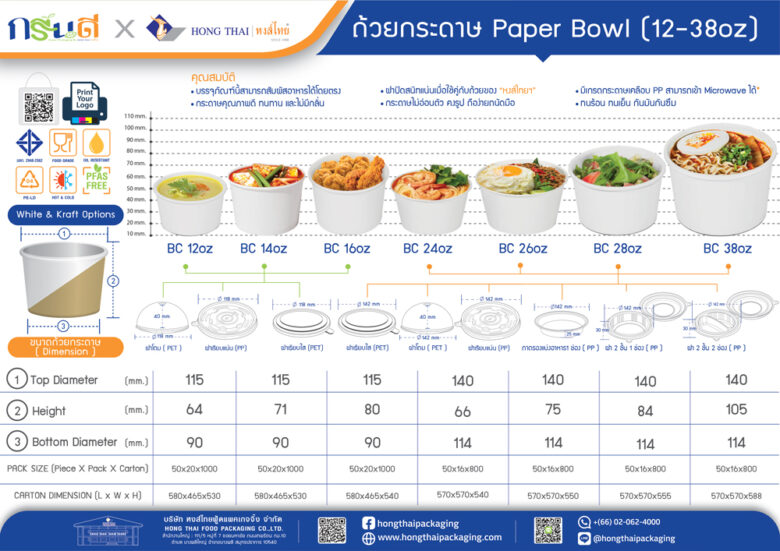 - ถ้วยกระดาษ ลายไทย 16 ออนซ์ ถ้วยกระดาษนอกจากจะสามารถบรรจุอาหารร้อนได้แล้ว ยังมีลวดลายที่เป็นเอกลักษณ์ เหมาะกับธุรกิจอาหารไทยในการบรรจุ ต้มยำกุ้ง แกงเขียวหวานไก่ เป็นต้น