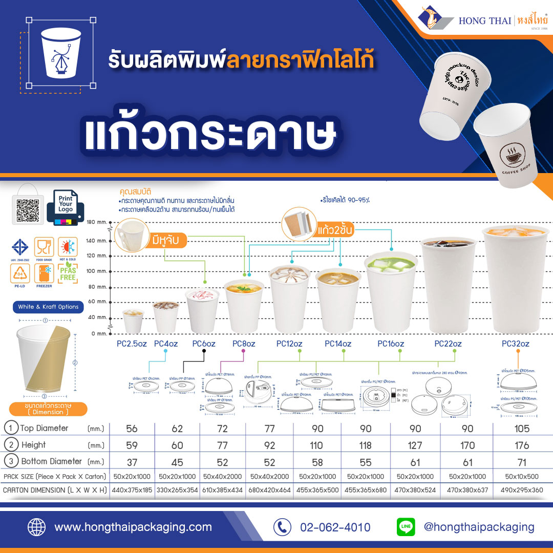 แก้วกระดาษของเรามีหลายขนาด ตั้งแต่ 4 ออนซ์ จนถึง 22 ออนซ์ มีให้เลือกทั้งสีขาวและกระดาษคราฟท์ ใช้ได้กับเครื่องดื่มร้อนและเย็น โดยแบ่งเป็น