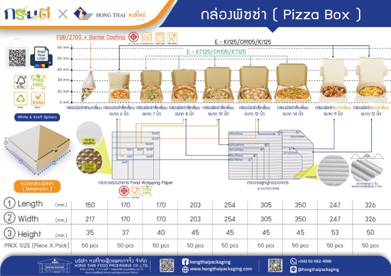 กล่องพิซซ่าหรือกล่อง Delivery พร้อมแผ่นกระดาษลูกฟูกรองอาหารใช้คู่กันได้ มีกี่ขนาดดังนี้ กล่องพิซซ่า ผลิตมาจากกระดาษลูกฟูก ลอน E มีสีครีม(KI) และ สีน้ำตาลธรรมชาติ(KT) มี 2 รูปแบบ