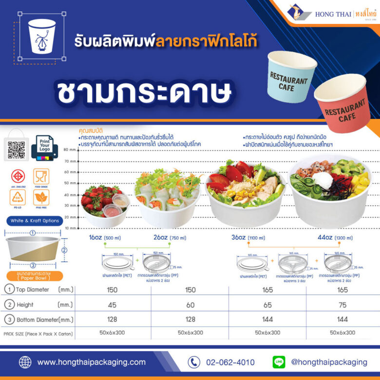 โรงงานรับผลิตชามกระดาษใส่อาหาร พิมพ์โลโก้ ลายกราฟิก ราคาเริ่มต้น 3.11 บาท ผลิตได้มาตรฐานลูกค้าไว้วางใจมากว่า 40 ปี พิมพ์เต็มพื้นที่ 6 สีคมชัด รองรับผลิตจำนวนมาก