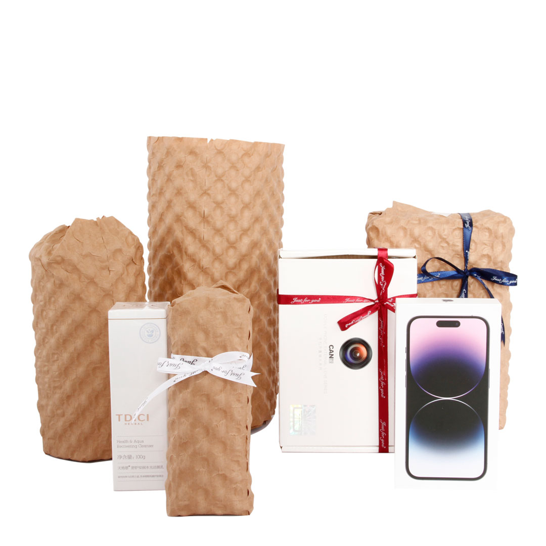 โครงสร้างกระดาษ 3 มิติ ยืดหยุ่นสูง ช่วยดูดซับแรงกระแทกได้ดีเยี่ยม ไม่ต้องใช้เทป สร้างมูลค่าให้สินค้า ประหยัดพื้นที่จัดเก็บ ย่อยสลายและรีไซเคิลได้