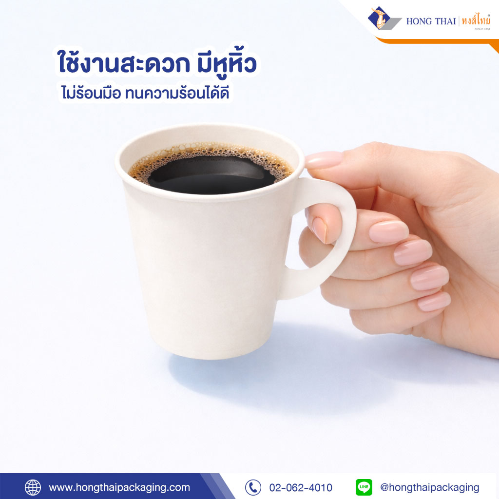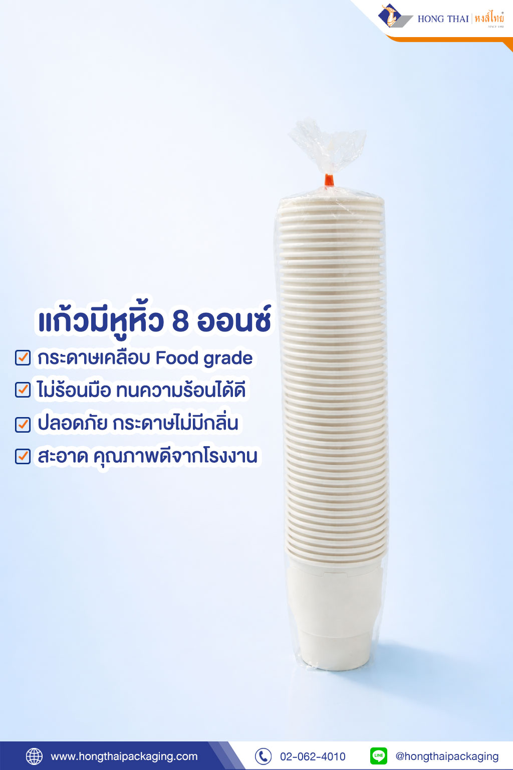 | วัตถุดิบ (Material) | กระดาษ food grade CSP1S/190+PE18M (ไม่สามารถใส่น้ำเย็นและน้ำแข็งได้) |