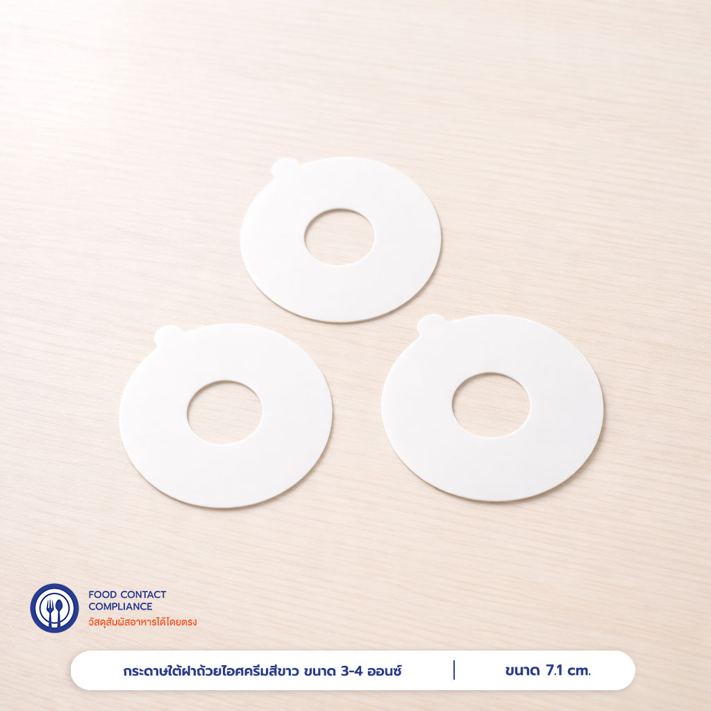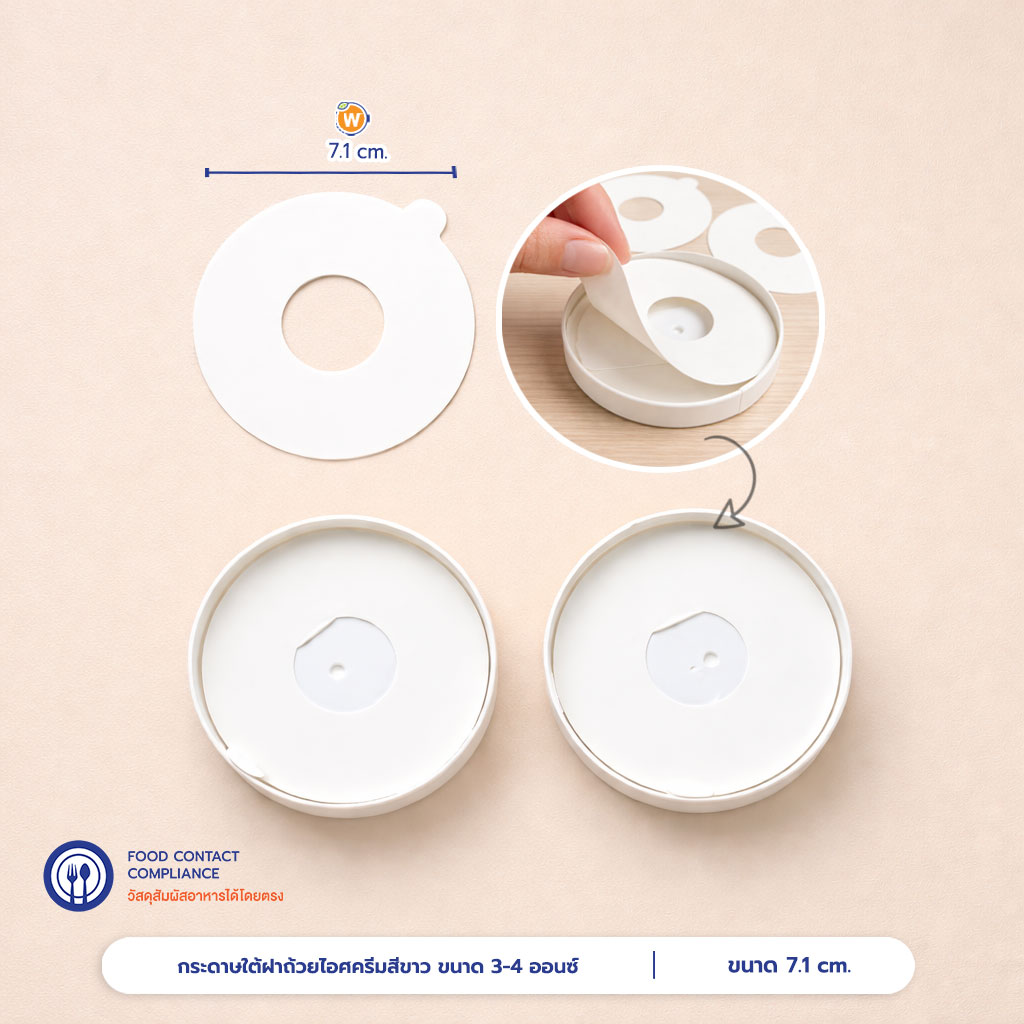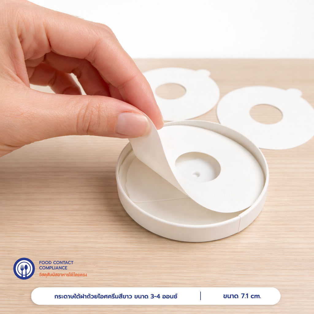 | การใช้งาน | กระดาษรองใต้ฝาถ้วยไอศครีมสีขาว ขนาด 3 – 4 ออนซ์ |