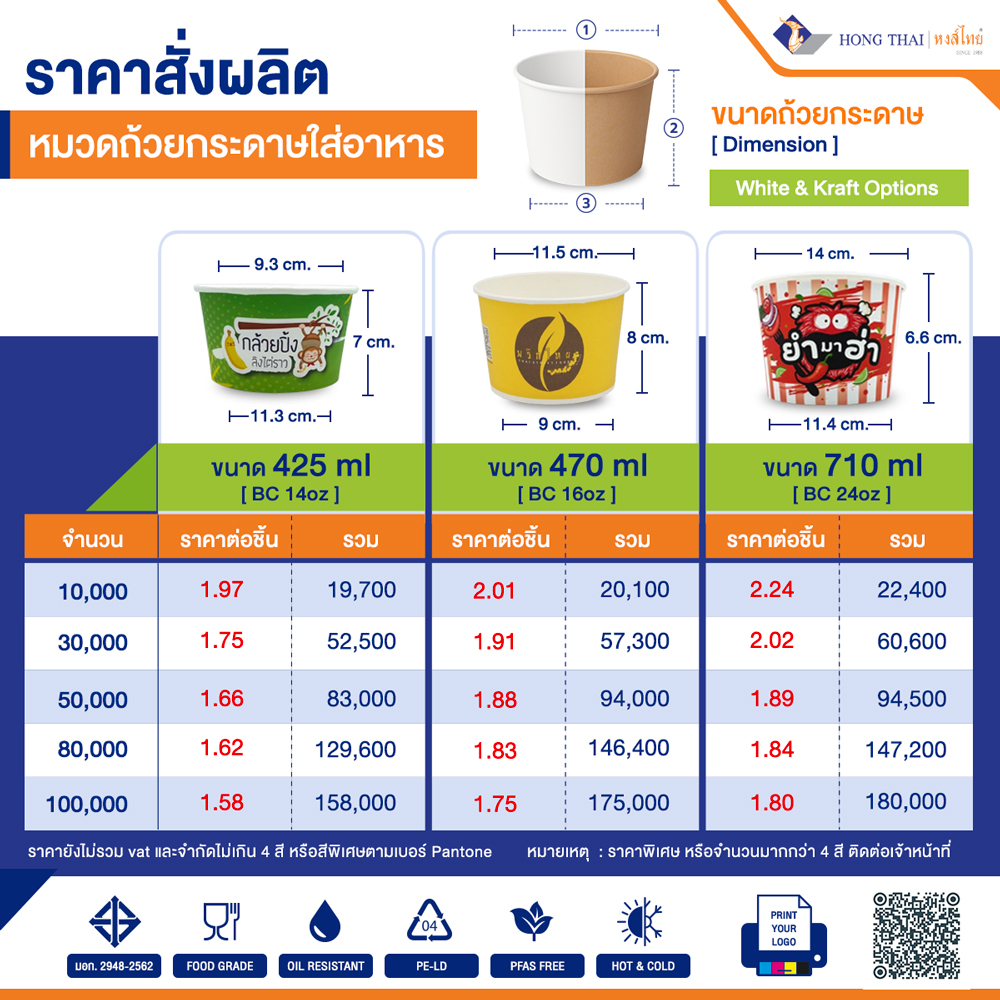 | วัตถุดิบ (Material) | กระดาษ food grade CSP1S/240g+PE18M |